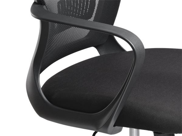 Kancelárska stolička s pohodlným sedadlom dizajnové prevedenie výškové nastavenie pomocou plynového piestu pevná, priedušná sieťovaná opierka chrbta nastaviteľná bedrová opierka aretovateľná hojdacia mechanika pevné opierky nosnosť: 110 kg Poťah: sedadlo: odolná, protioderová látka operadlo: napnutá sieťovaná tkanina
