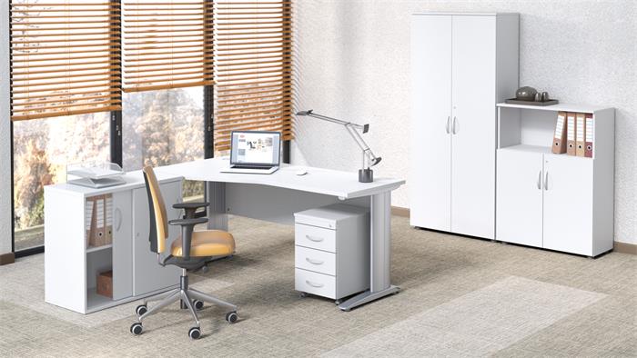 Písací stôl, oblúkový, pravý, so sivými kovovými nohami, 160 × 80 cm, MAYAH „Freedom SV-29“, biela