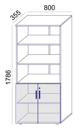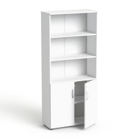 Kombinovaná skriňa, výška na 5 zakladačov, s dverovou a otvorenou policovou časťou.