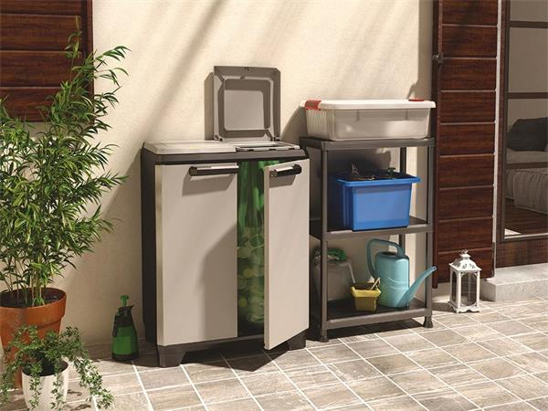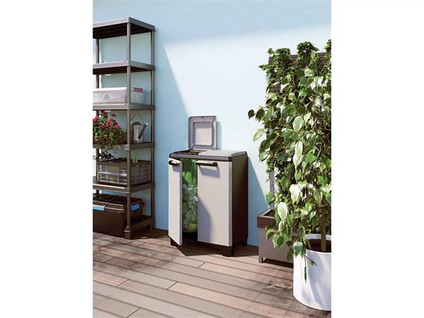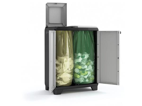KETER Split Premium odpadkový kôš/skrinka na triedený odpad vďaka praktickému dizajnu a modernému tmavosivému/čiernemu vzhľadu štýlovo a jednoducho prispieva k ochrane životného prostredia. -vhodná na uloženie dvoch vriec s objemom do 110 litrov -vyrobená z polypropylénu, odolná voči mechanickému poškodeniu a poveternostným vplyvom, takže ju možno umiestniť v interiéri aj exteriéri, napríklad na krytej terase -ľahko sa čistí - jednoduchá montáž -vybavená dvoma hornými vekami so špeciálne tvarovanými otvormi pre jednoduché otváranie - predné dvojkrídlové dvierka s pohodlnými úchytkami - s nastaviteľnými nohami -rozmery: 39x68 x92 cm (šírka x hĺbka x výška) -hmotnosť: 5,74 kg - vrecia nie sú súčasťou balenia